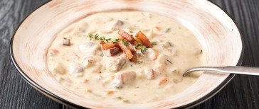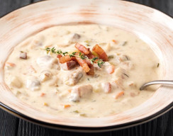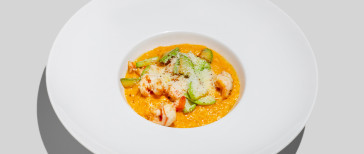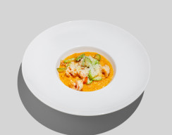 Состав: Лук шалот, морковь, креветки тигровые, томатная паста, сельдерей, фенхель, помидоры, чеснок, кабачки, цукини, сливки 22%, масло оливковое, масло сливочное, пармезан.