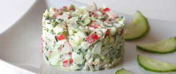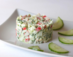 Состав: капуста китайская, крабовые палочки, майонез, перец болгарский, зелень, кукуруза, огурцы свежие.