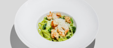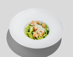 Состав : паста(лингвини), креветки тигровые,шпинат , масло оливковое,чеснок, сыр " Пармезан",петрушка, соль, сливки 22%.