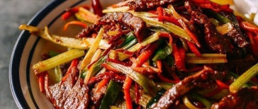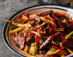 Состав: говядина, кабачки, перец болгарский, лук красный, морковь, сельдерей, корень имбиря, чеснок, перец чили, соус устричный, масло подсолнечное, соус соевый, крахмал, масло кунжутное, кунжут.