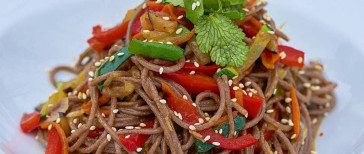 Состав: лапша гречневая, лук репчатый, перец болгарский, морковь, масло кунжутное, масло подсолнечное, кунжут, соль, соевый соус, кабачки цукини, ростки сои, соус терияки.
