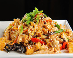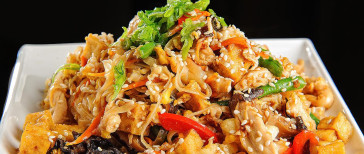 Состав: лапша рисовая, куриное филе, морковь, лук репчатый, перец болгарский, кабачки, масло кунжутное, масло растительное, соус терияки, кунжут, соль.