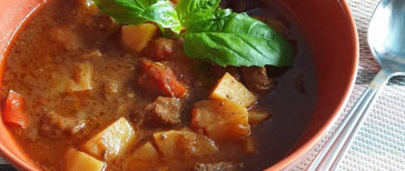 Состав: говядина, лук репчатый, перец болгарский, томатная паста,мука, масло подсолнечное, зелень, лавровый лист.