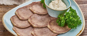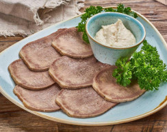 Язык говяжий отварной со сливочным соусом с хреном 70/25гр.