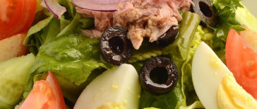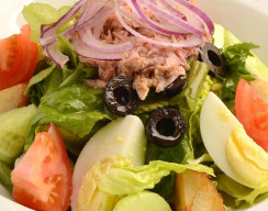 Состав: яйцо отварное, картофель, капуста китайская, маслины/оливки, помидоры, тунец конс, зелень, перец , соль.