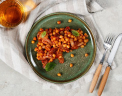 Состав: филе грудки индейки, нут отварной, перец болгарский, лук репчатый, масло оливковое, розмарин, соль, специи.